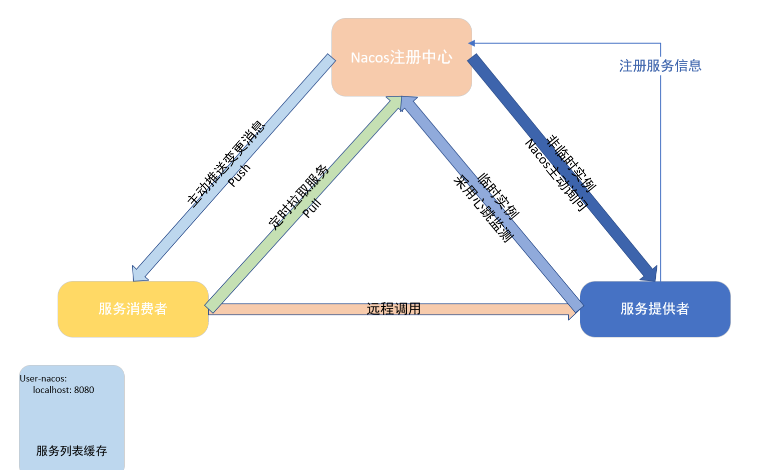 由此,我们可以直观得看到,nacos比eureka多了临时实例和非临时实例的概念,nacos对于非临时实例,除了服务每隔一段时间发出心跳,注册中心也会每隔一段时间主动询问服务是否健康,如若服务状态发生变化,注册中心也会主动向服务消费者推送更新服务提供者的信息,健康监测方面比eureka更加完善